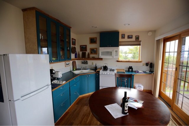 Meine Wohnung liegt im 2. Stock oberhalb der Holzwerkstatt und etwa 30 Meter vom Haupthaus entfernt, Ruhe und Privatsphäre sind also garantiert. Ebenfalls auf dem Gelände befindet sich noch ein grosses Gewächshaus mit Salat, Gemüse und Obst, wo man sich als Gast ebenfalls bedienen darf, sowie eine Beobachtungplattform, von der aus man Otter und Vögel sehen kann – beides werde ich mir morgen mal genauer anschauen!