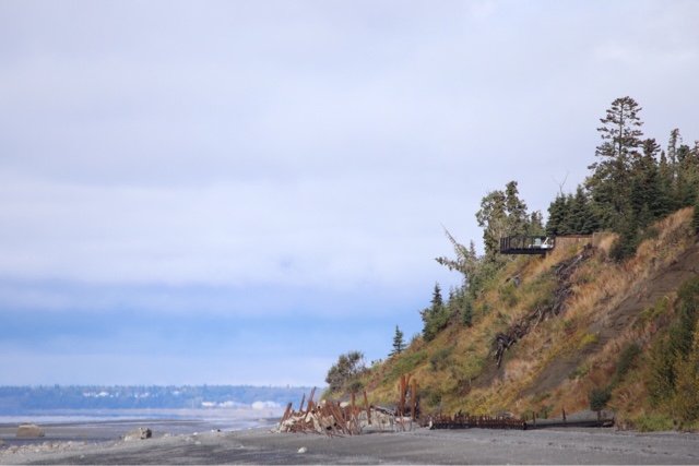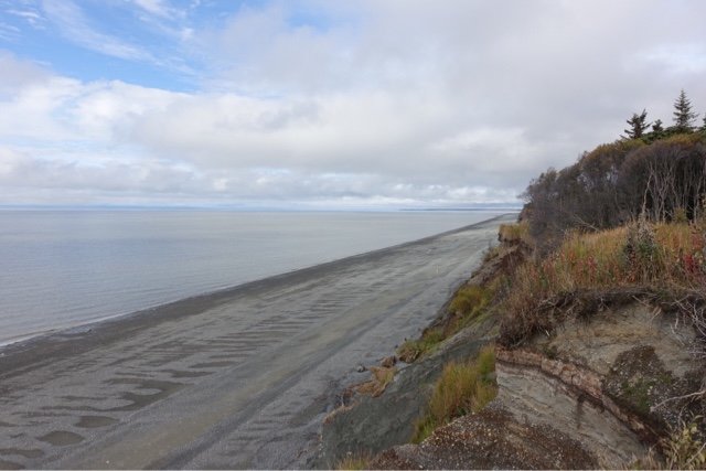 Anstatt danach auf direktem Weg über den Sterling Highway nach Süden zu fahren, nehme ich den längeren Weg an der Küste entlang über die Kalifornsky Beach Road. Die meisten Zufahrten mit Zugang zum Strand sind leider privat. Bei der ersten nicht verbotenen Abzweigung komme ich dann aber mit meinem Auto nicht durch – dafür klart das Wetter langsam auf, und man sieht wieder etwas mehr von der schönen Umgebung