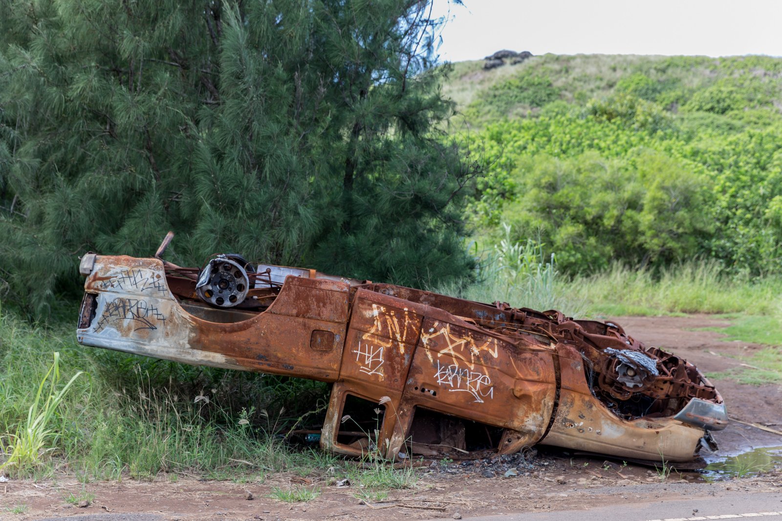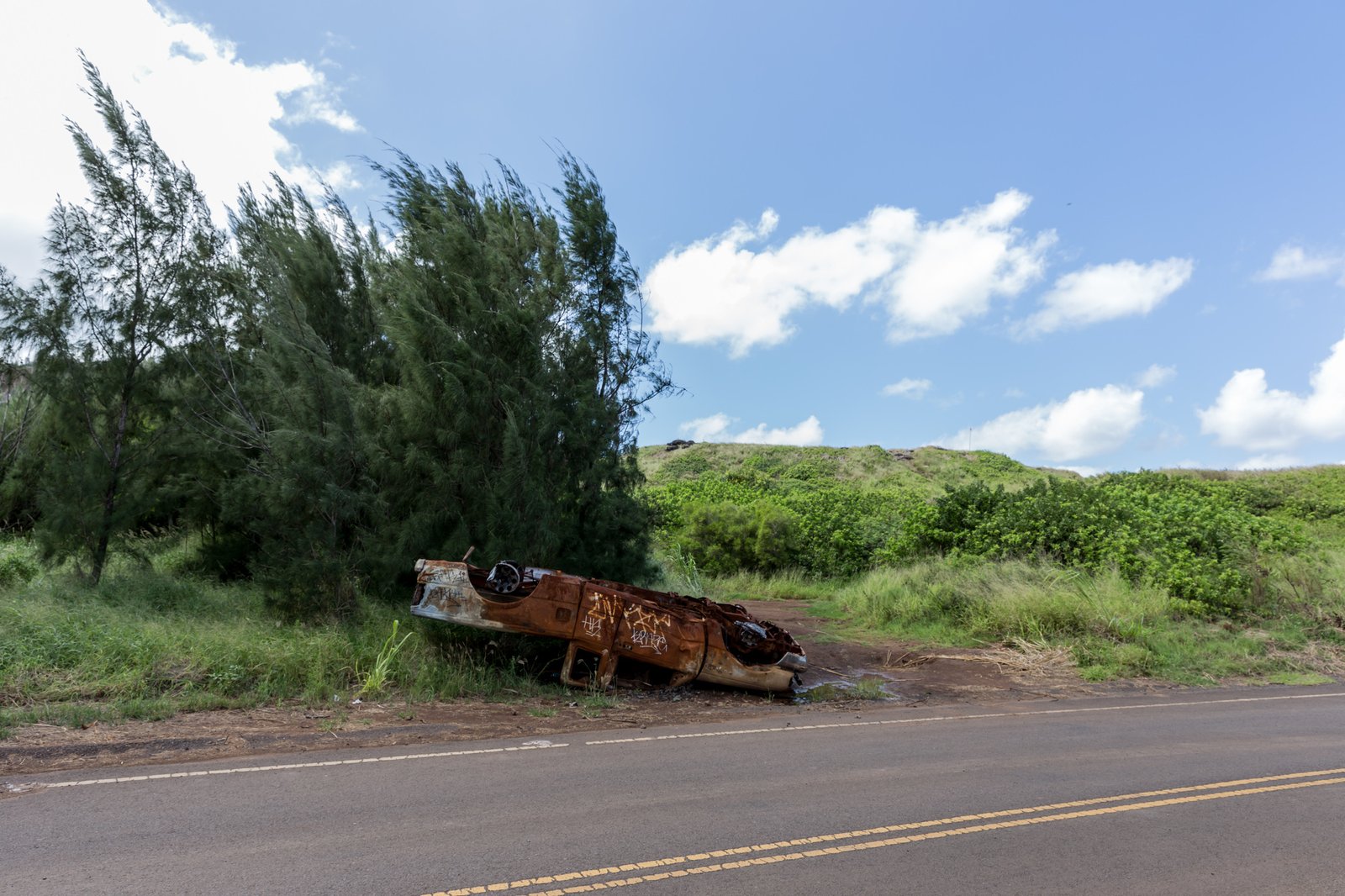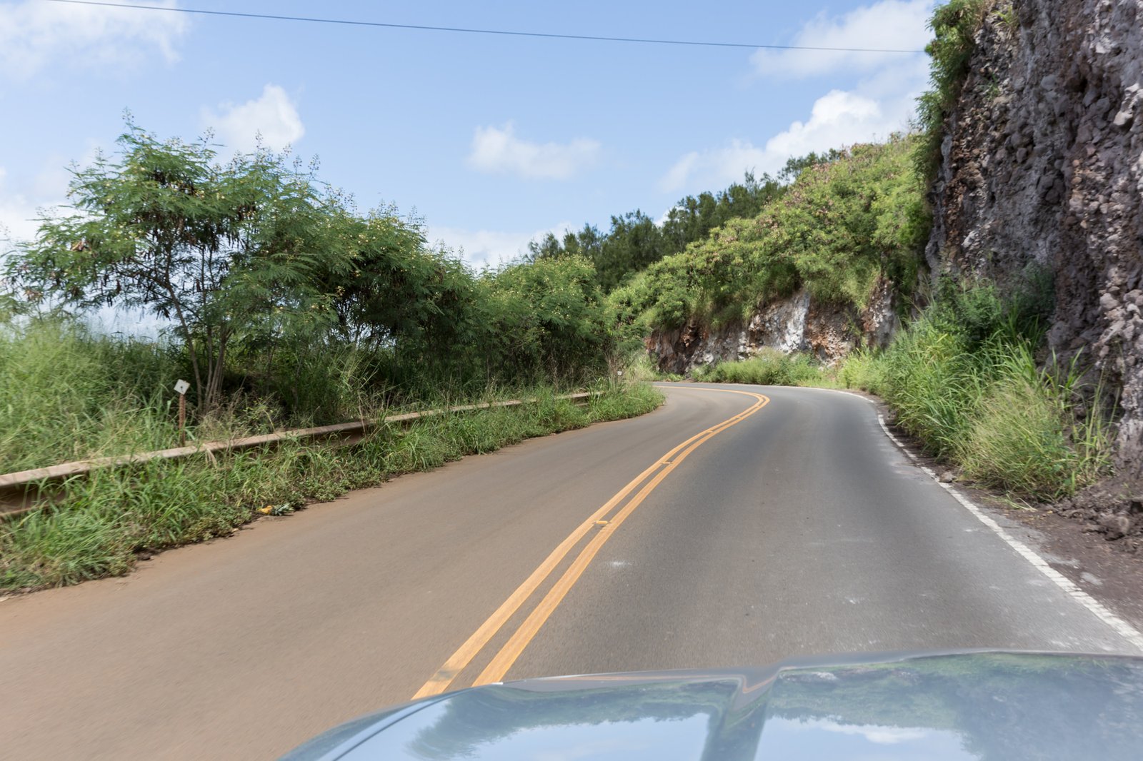 Einige Meilen später verengt sich die Strasse auf eine Spur, und zwar wirklich so, dass keine 2 Autos aneinander vorbeipassen – im Zweifelsfall muss man also auch mal rückwärts fahren bis zu einer der gelegentlichen Buchten. Ursprünglich wollte ich die ganze Strecke bis Kahului durchfahren, und von dort über die modernen Highways zurück. Dann stelle ich aber fest, dass es gute 25 Kilometer sind, die ich auf dieser einspurigen Strecke zurück legen müsste … und nach etwa 300 Metern treffe ich auf einen Einheimischen, der beim Ausweichen mit seinem Wagen über die Böschungskante gerutscht ist und gerade auf den Abschleppwagen wartet. Das sieht mir nach deutlich zu viel Stress und zu wenig Spass aus, also drehe ich lieber wieder um.