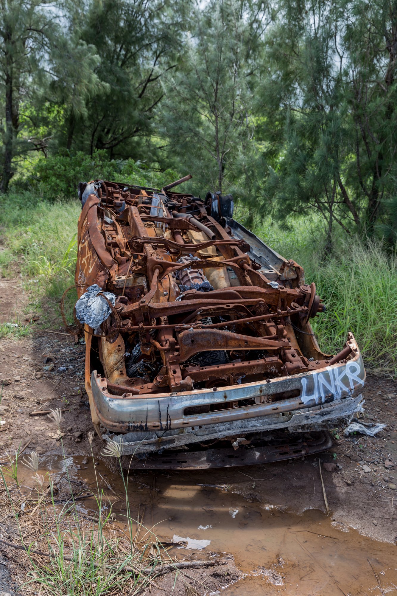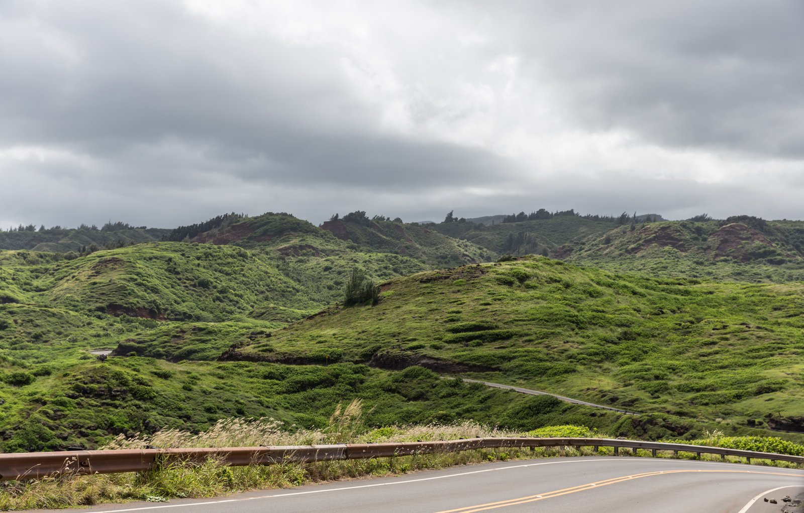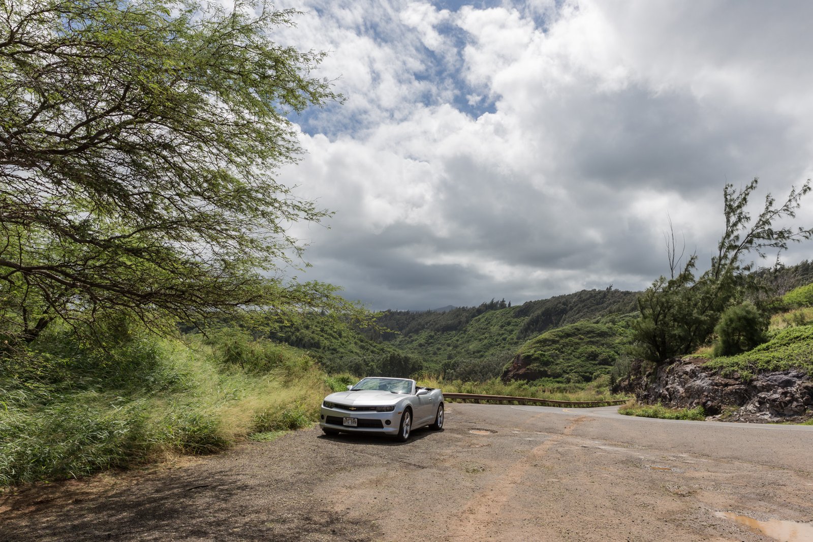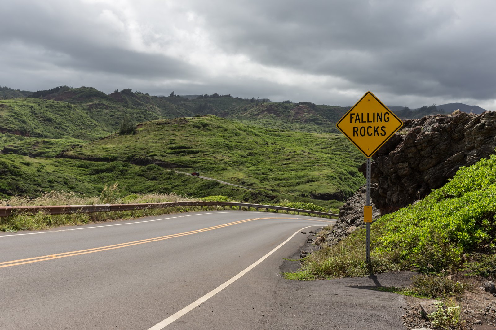 Einige Meilen später verengt sich die Strasse auf eine Spur, und zwar wirklich so, dass keine 2 Autos aneinander vorbeipassen – im Zweifelsfall muss man also auch mal rückwärts fahren bis zu einer der gelegentlichen Buchten. Ursprünglich wollte ich die ganze Strecke bis Kahului durchfahren, und von dort über die modernen Highways zurück. Dann stelle ich aber fest, dass es gute 25 Kilometer sind, die ich auf dieser einspurigen Strecke zurück legen müsste … und nach etwa 300 Metern treffe ich auf einen Einheimischen, der beim Ausweichen mit seinem Wagen über die Böschungskante gerutscht ist und gerade auf den Abschleppwagen wartet. Das sieht mir nach deutlich zu viel Stress und zu wenig Spass aus, also drehe ich lieber wieder um.