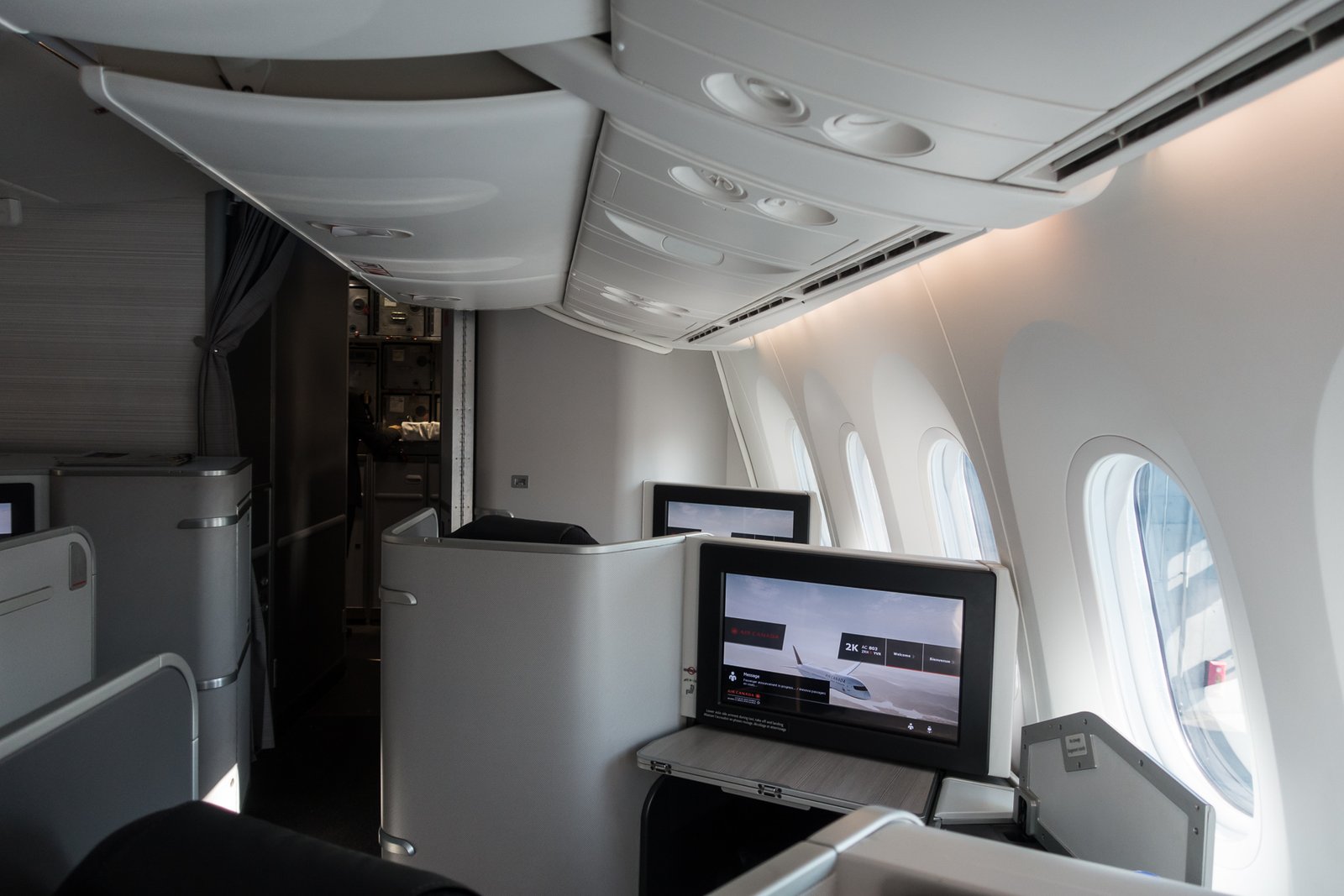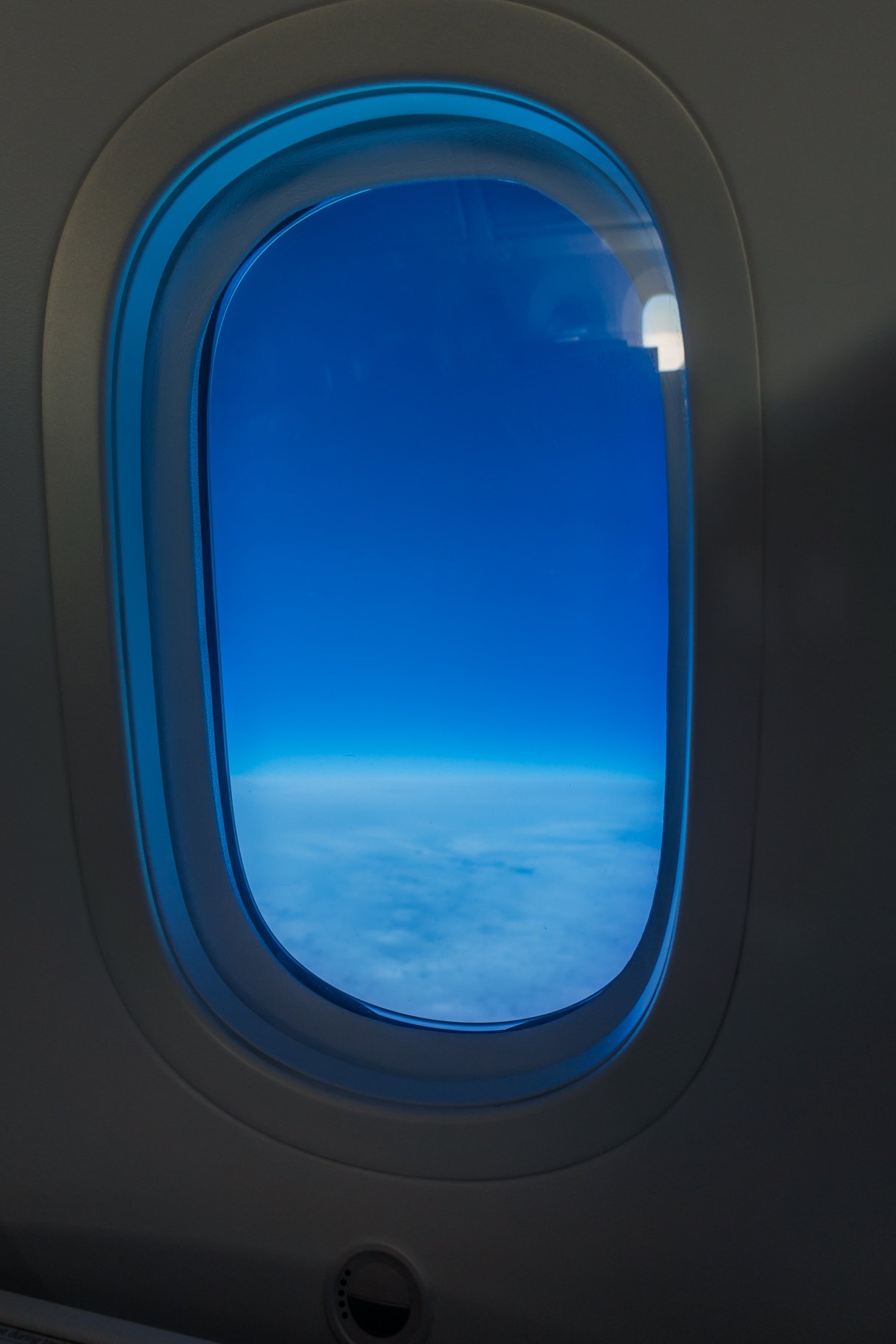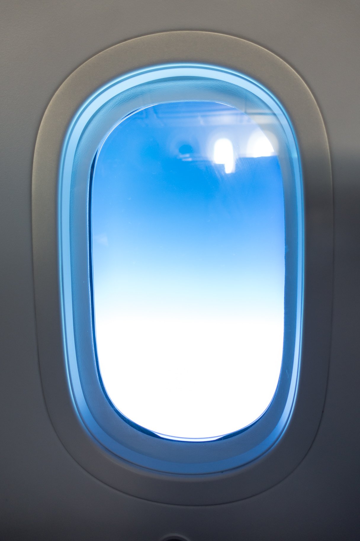 Kleiner Gadget-Touch: die Fenster im Dreamliner haben keine Verdunkelung aus Plastik mehr; statt dessen ist in jedes Fenster eine Folie eingebettet, die sich per Knopfdruck in 6 Stufen elektrisch verdunkeln lässt.