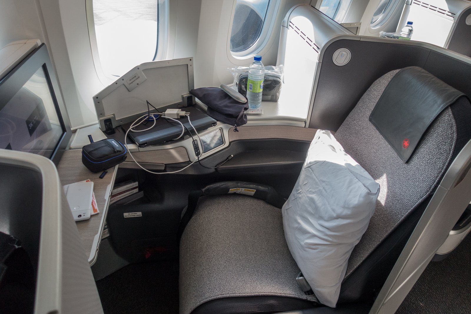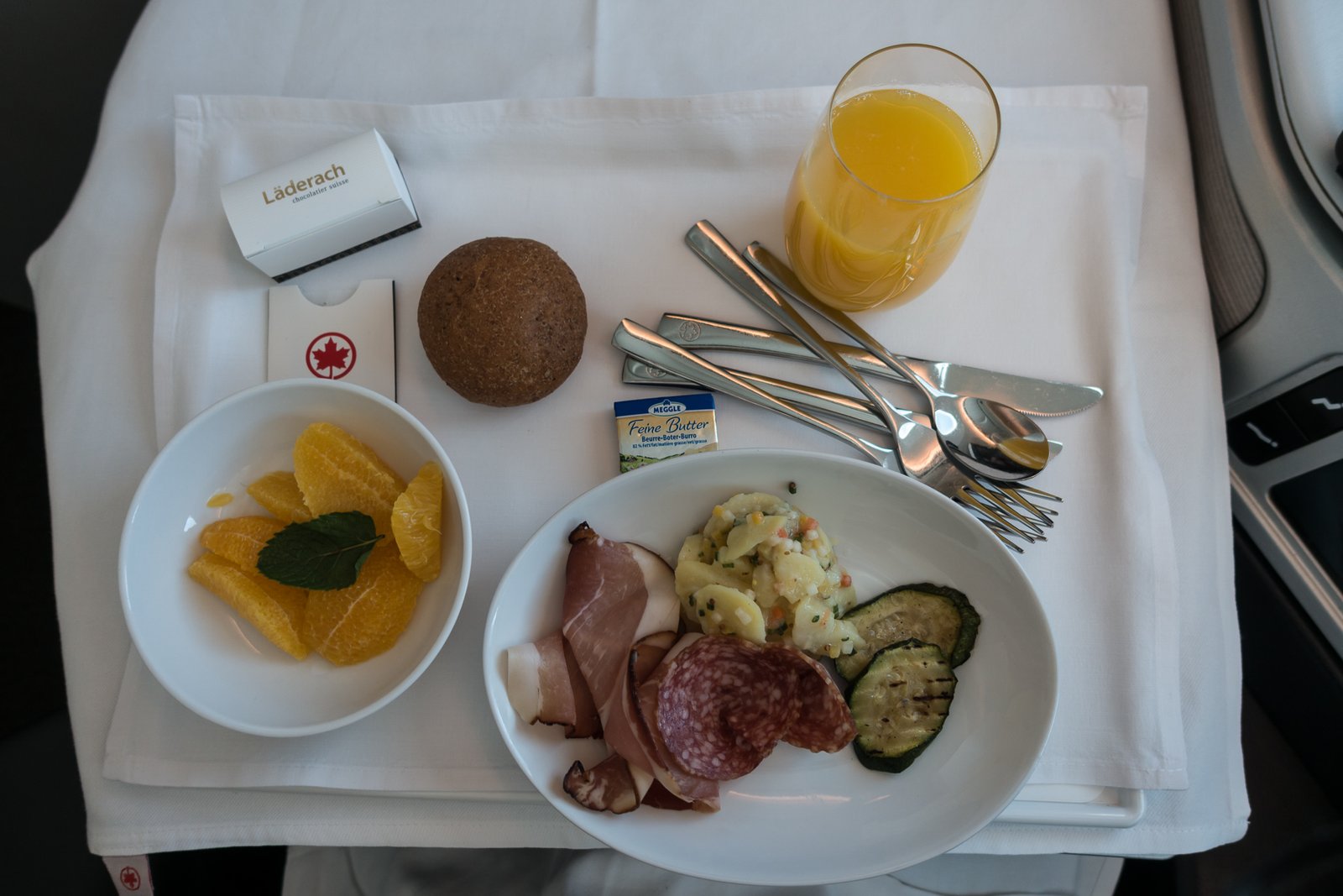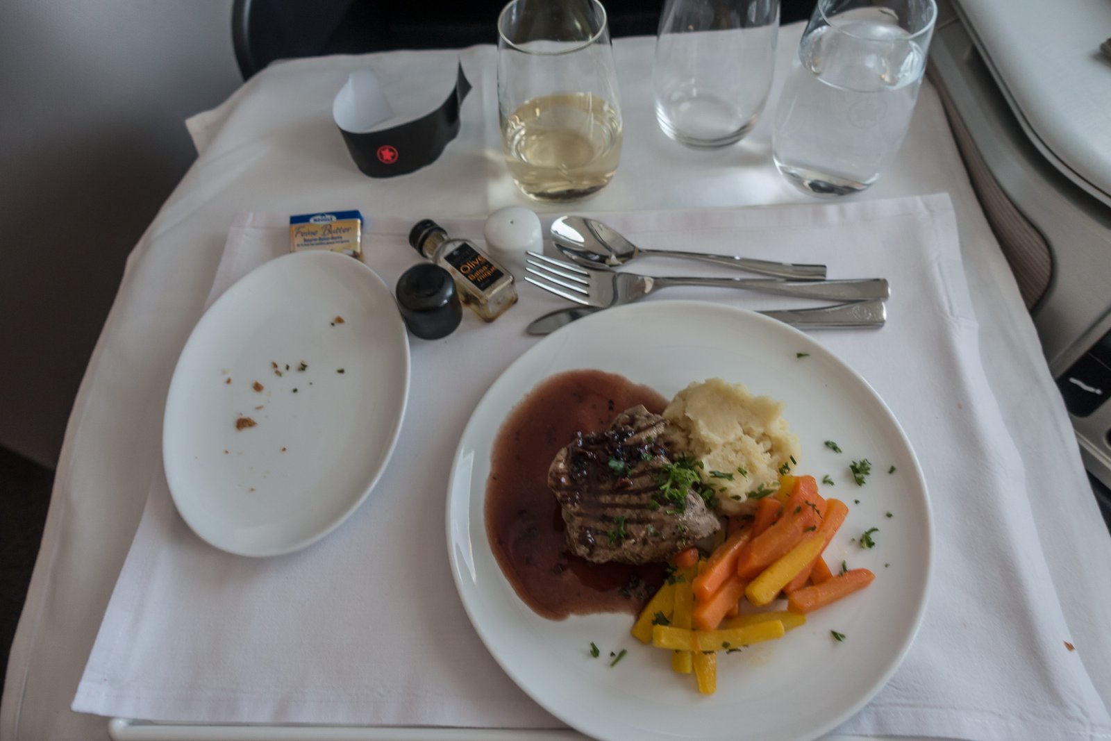 Das Boarding um 9.25 Uhr geht dann auch schnell über die Bühne, und wenig später sitze ich bereits mit dem ersten Glas Champagner auf meinem super bequemen Platz 3K. Air Canada hat für diese Strecke ihre neuen Dreamliner (Boeing 787-8) aufgeboten, die mit der neuesten Version ihrer Business Class Sitze in einer 1-2-1 Konfiguration ausgerüstet sind – jeder Sitz hat so direkten Zugang zum Gang, ohne über jemanden drübersteigen zu müssen. Dazu kommt noch sehr viel Platz und Stauraum, und für später liegt eine Matratzenauflage, Decke und Kissen bereit, mit der sich der Sitz in ein 2.05m langes Bett verwandeln lässt. Der perfekte Start in den Urlaub!